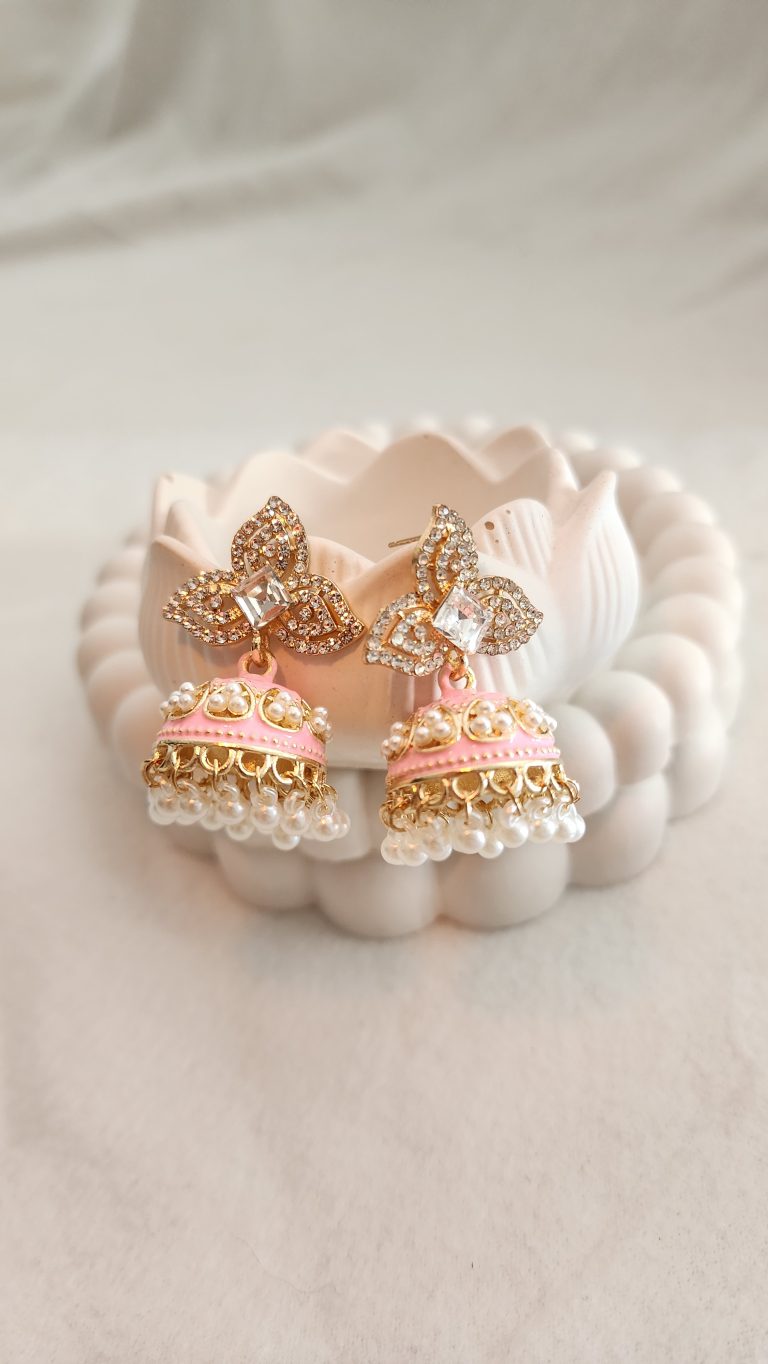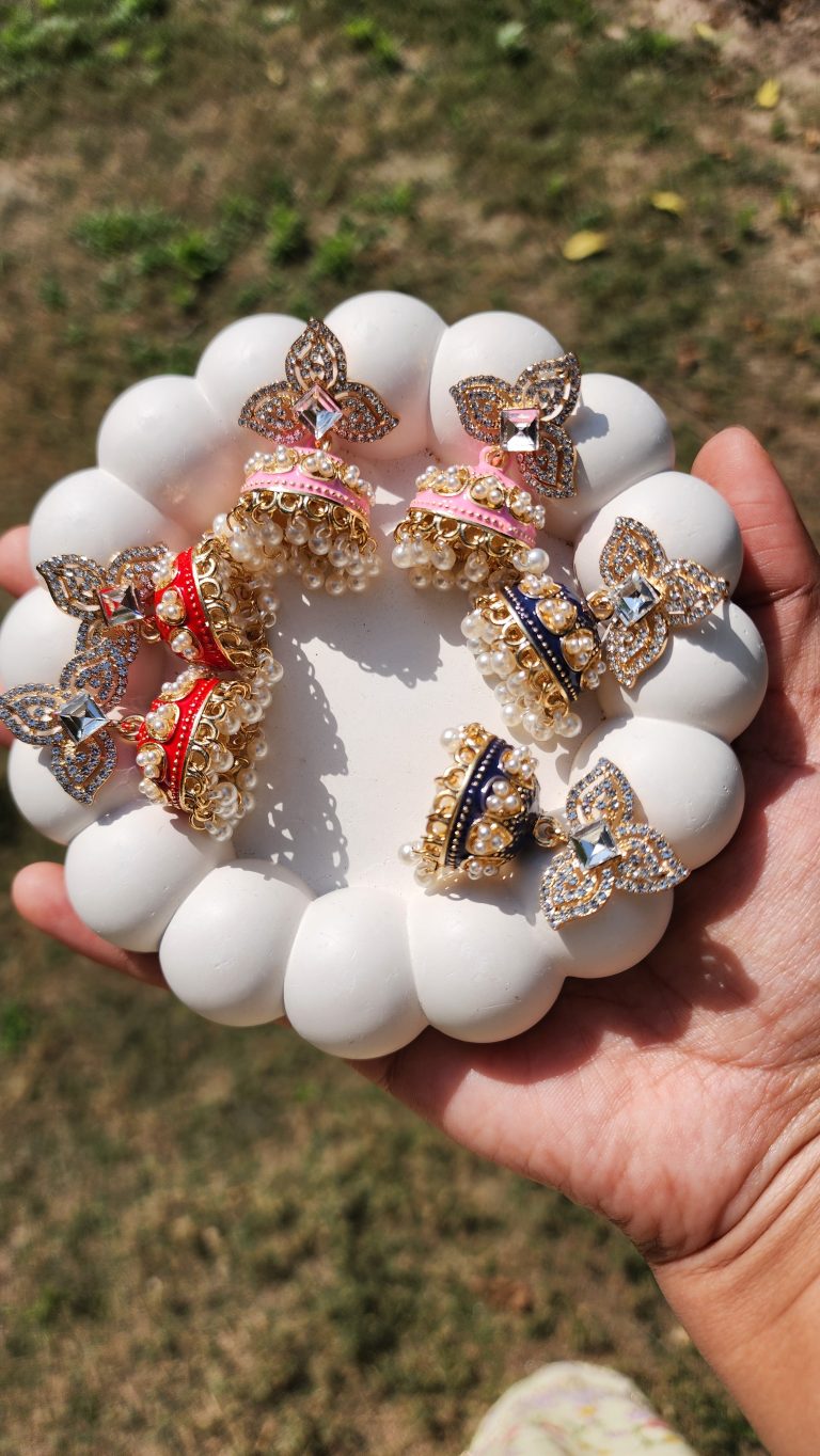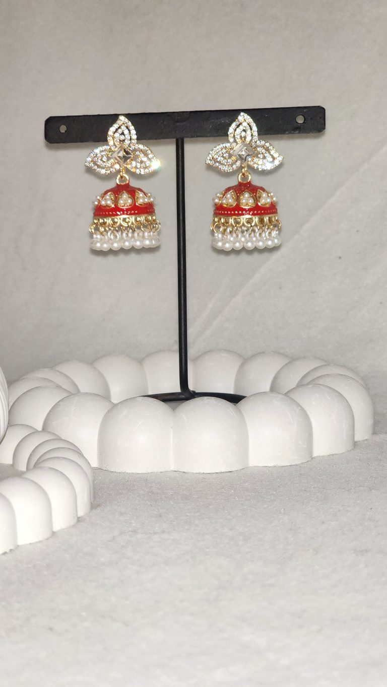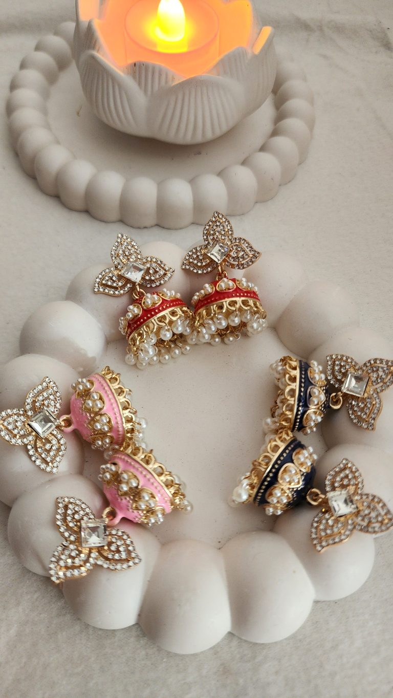 The dome-shaped jhumki is enhanced with rich enamel colors — red, pink, and navy blue — paired with delicate pearl hangings for a graceful traditional finish. The fine gold-plated polish gives a premium look, making it ideal for Eid collection, wedding events, mehndi functions, and formal gatherings.
