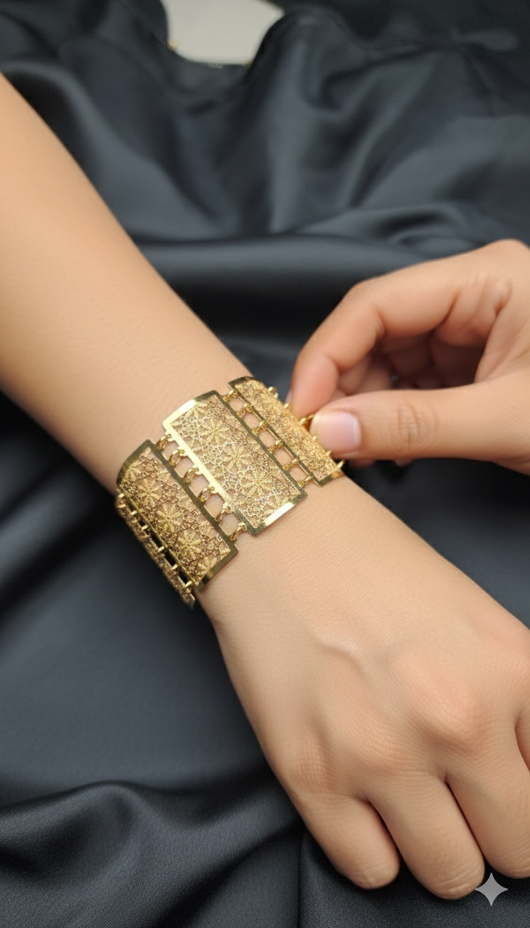 Enhance your jewellery collection with this gold finish bracelet, crafted to give the look and feel of original gold while remaining lightweight and comfortable for everyday wear. Designed with a fine net-based floral pattern, this bracelet reflects delicate craftsmanship and timeless elegance.