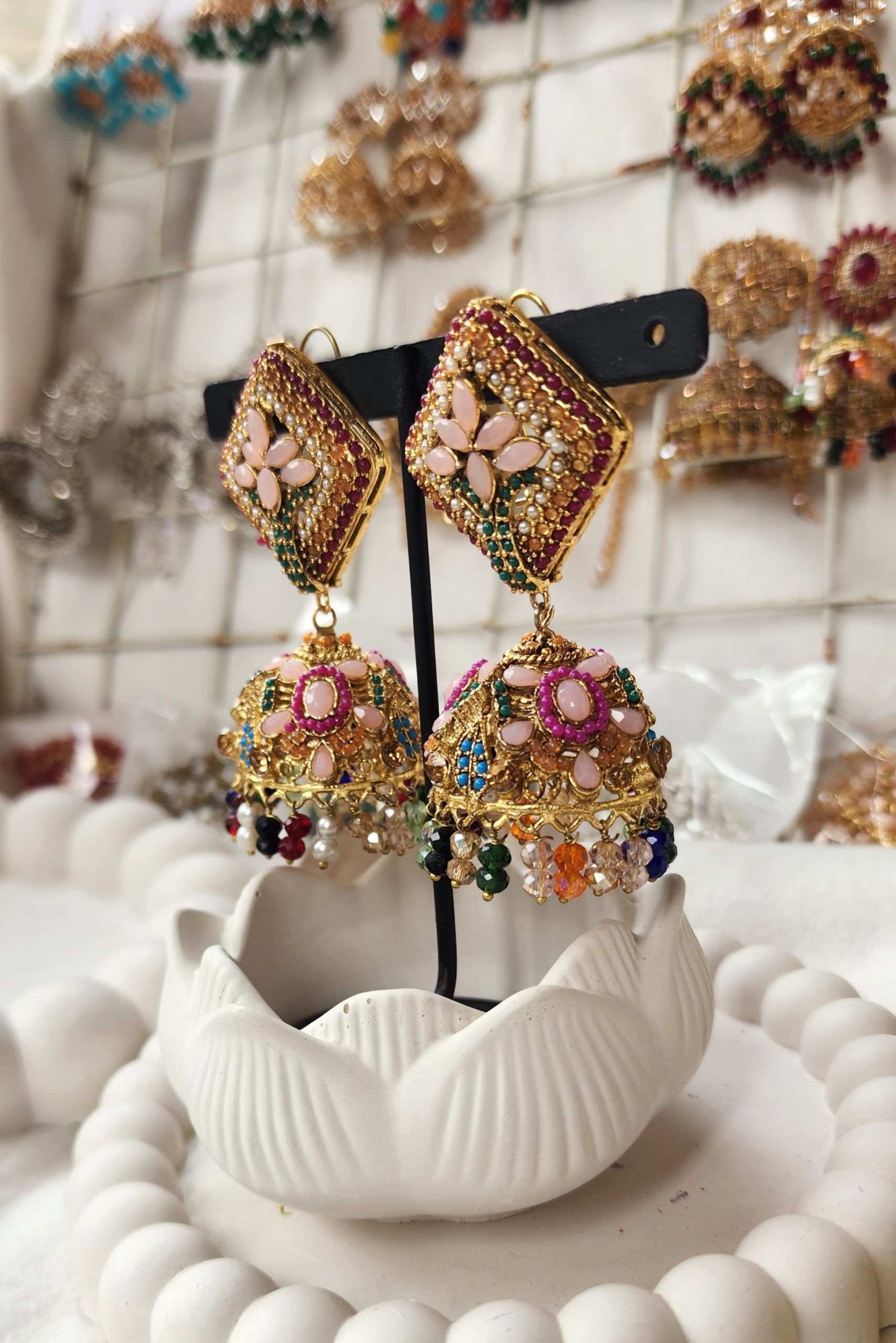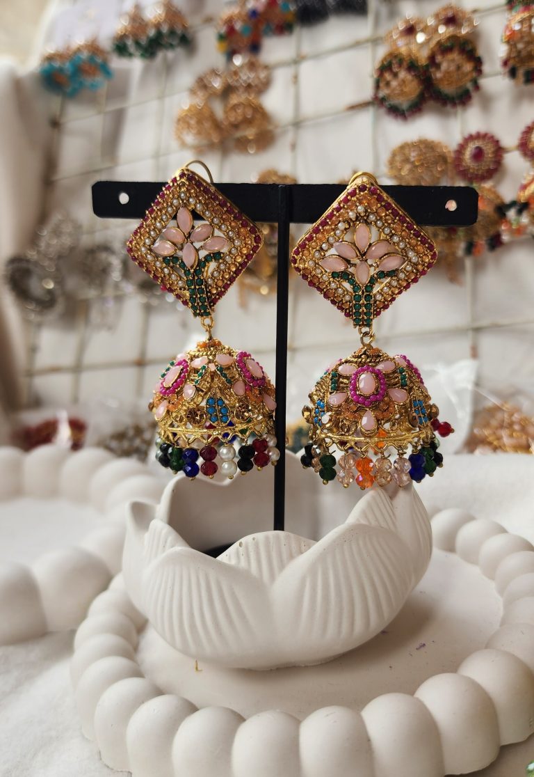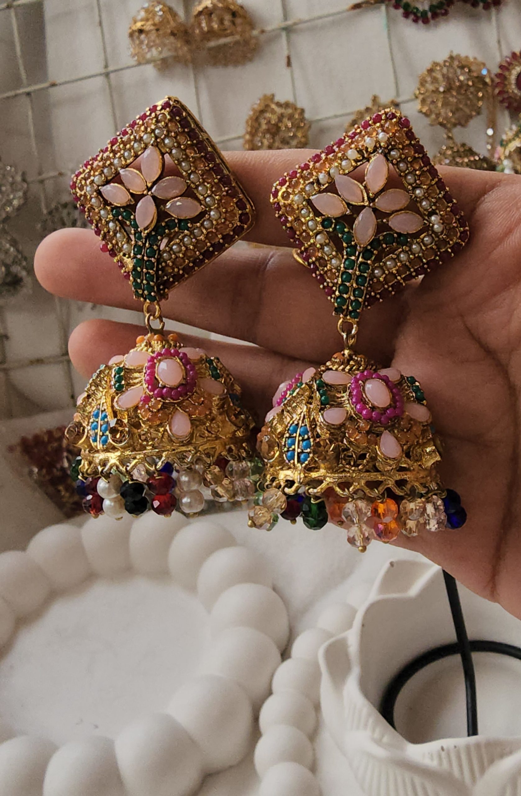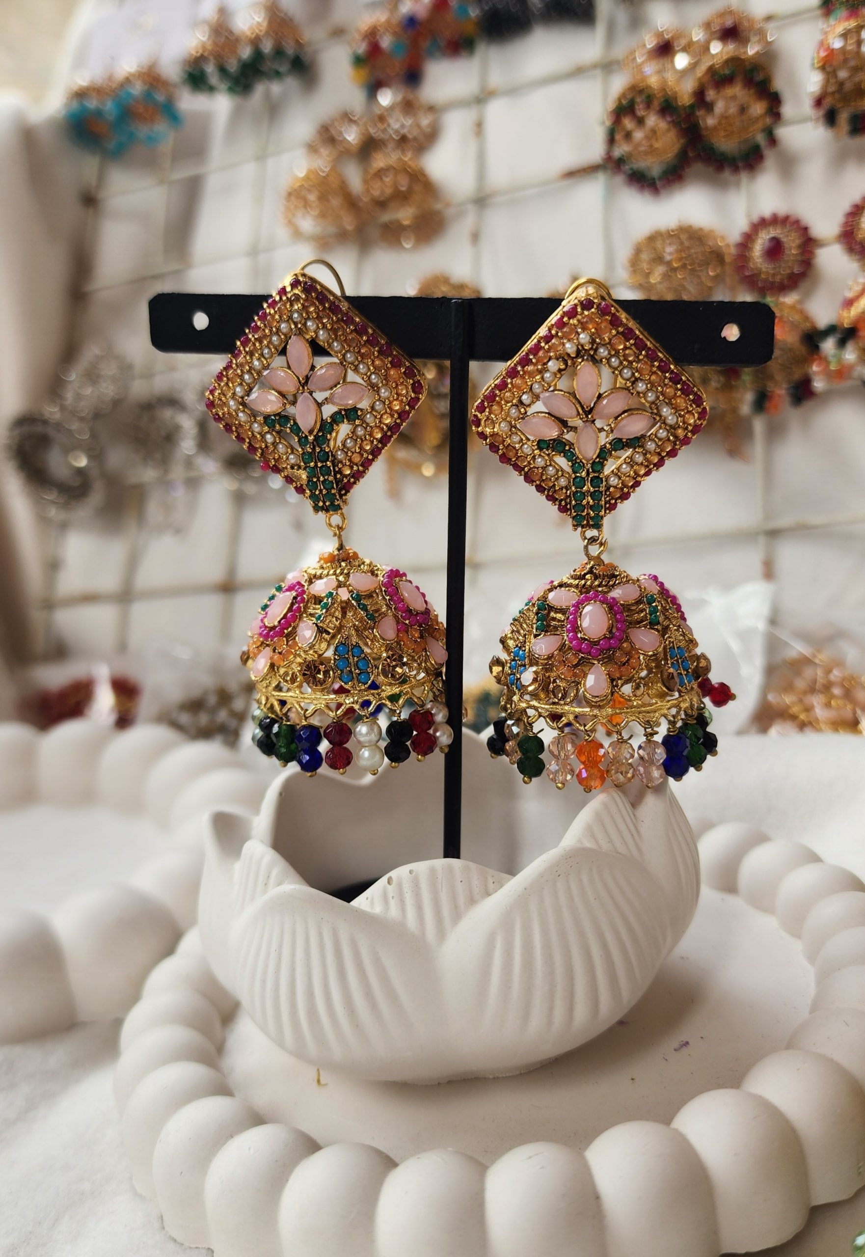 Introducing our exclusive Eid & Wedding Collection Premium Rajwari (milky multi-stone) Jhumki (Large Size) Earrings, specially designed for women who want a perfect blend of festive charm and formal elegance. These beautifully crafted traditional Pakistani jhumkas are ideal for Eid ul Fitr, Eid ul Adha, wedding season, mehndi nights, barat ceremonies, walima receptions, and family gatherings.