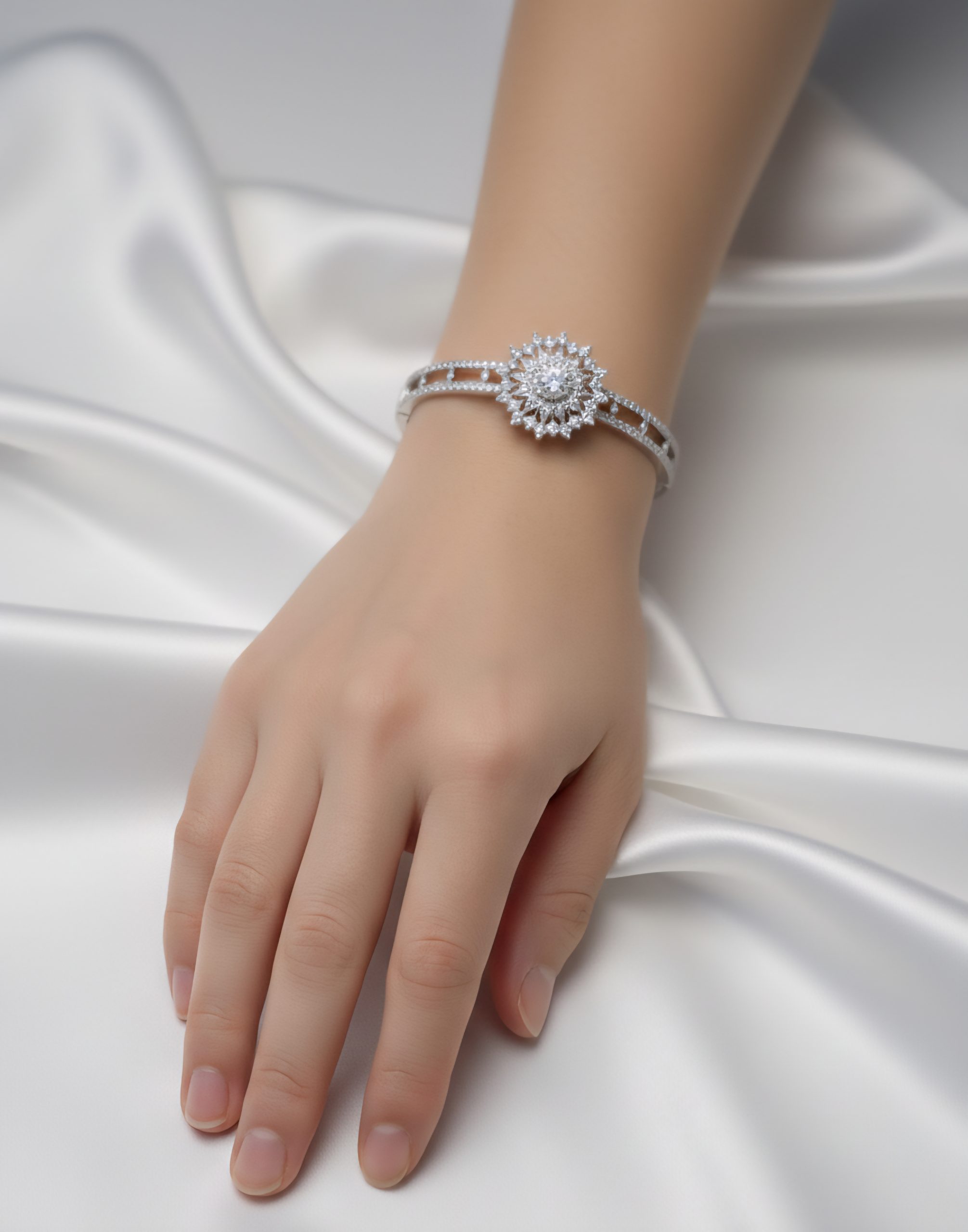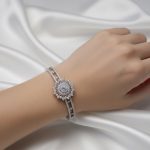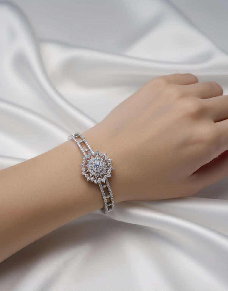 Elevate your jewellery collection with the Premium Signature Zircon Bangle, a statement 1K silver colour plated bracelet bangle crafted for women who appreciate refined luxury and modern elegance. This exquisite piece features a circular flower-inspired centre design, beautifully indented with high-quality zircon stones in triangle, diamond, and round shapes, creating a unique and eye-catching sparkle.