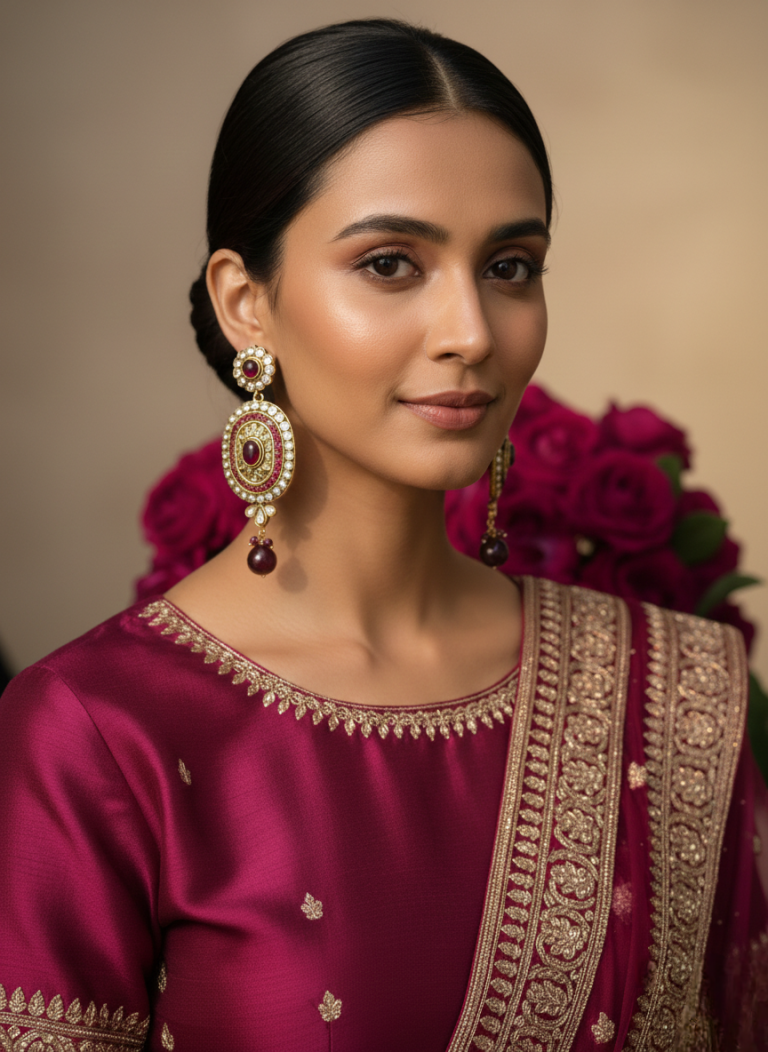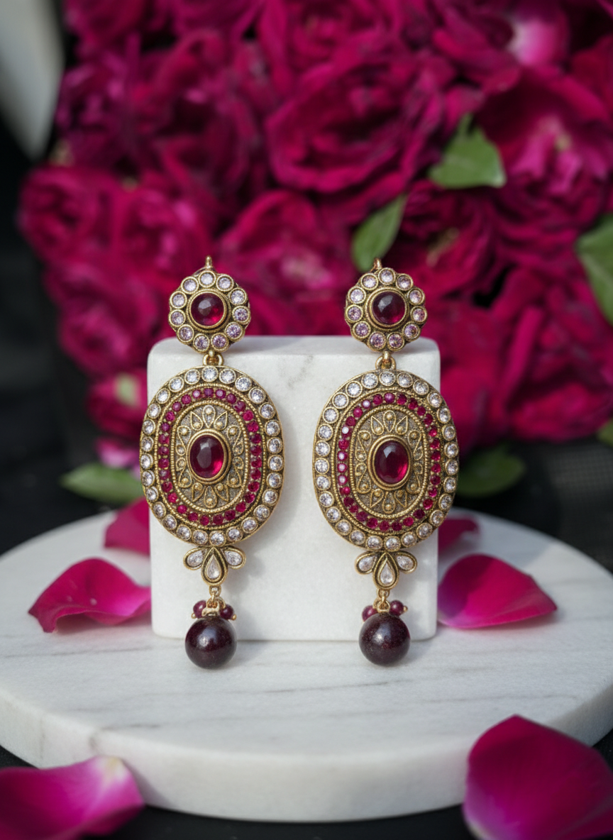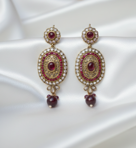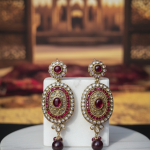 The top stud mirrors the circular motif, creating a balanced royal look, while the hanging red bead drop adds graceful movement and charm. Lightweight yet eye-catching, these earrings are ideal for bridal wear, wedding events, festive celebrations, and formal gatherings.