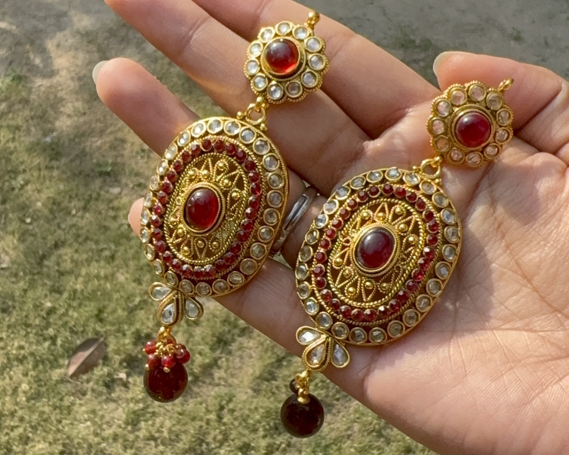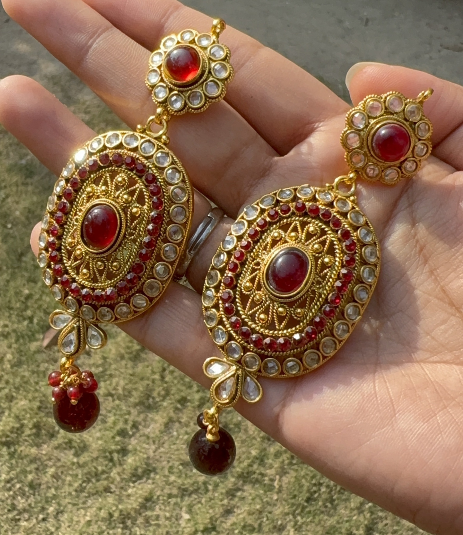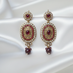 Royal Noor Red Kundan Statement Earrings are crafted in a traditional gold-tone finish with intricate detailing inspired by timeless South Asian artistry. The design features a bold oval silhouette adorned with a rich ruby red center stone, surrounded by shimmering white crystal accents and fine textured metalwork.